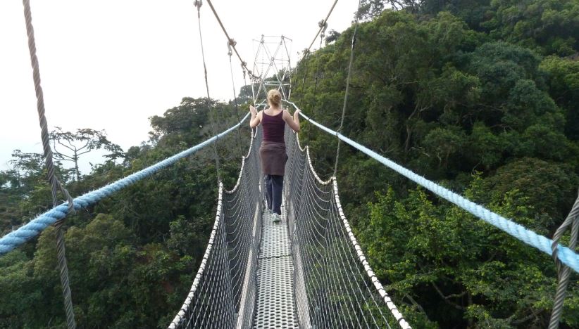 Canopy Walk: Nyungwe Forest National Park is blessed to have a very huge canopy because of the largeness of the forest and travelers have a chance to walk on the top as they view the parks’ features. The canopy walkway give a traveler the opportunity to walk 50 meters above the ground as high as the tree tops as you get a chance to see different bird species, primate species and exploring the tree species. The canopy walk way is a suspended bridge in the tree tops with 50 above the ground. The canopy walk is done along the Igishigishigi Trail, and starts at 9am and the other canopy walkway at 3pm. A traveler pays only 60$ for foreign non residents, 50$ for foreign residents and only 5000 Rwf for Rwandan Nationals.